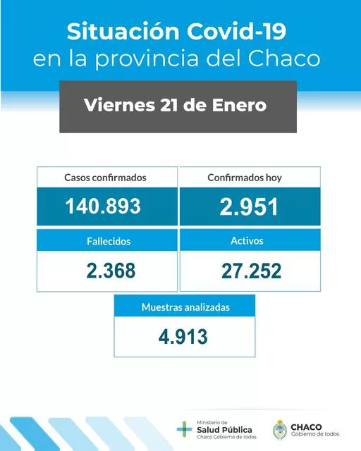 El Ministerio de Salud Pública del Chaco precisa que hasta este viernes 21 de enero de 2022 se registran 140.893 casos confirmados de COVID-19 y 27.252 permanecen activos.